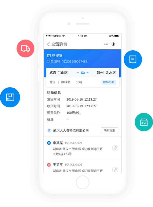 订单状态变化随时掌握,承运方车辆司机信息随时查看 在线收货、查看轨迹